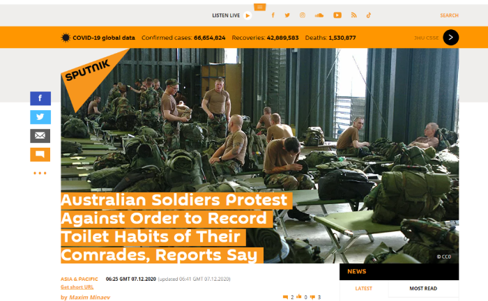 面對(duì)這種要求,士兵憤怒抗議稱這種要求是“公然企圖剝奪尊嚴(yán)并貶低他們”。報(bào)道稱,這些數(shù)據(jù)還會(huì)被添加到機(jī)密的22頁(yè)澳大利亞國(guó)防部“排便/排尿(Poo/Wee)”操作日志中。