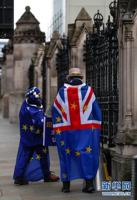 12月9日,反對“脫歐”的示威者手舉標(biāo)語牌站在英國倫敦議會大廈外。