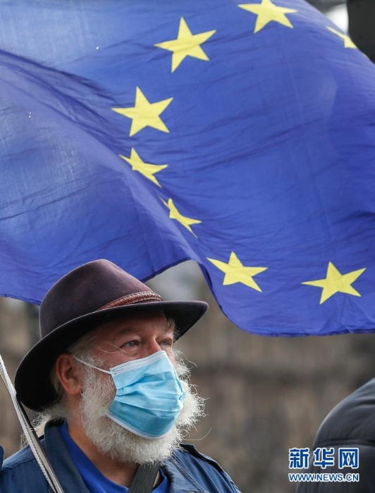 12月9日,反對“脫歐”的示威者手舉歐盟旗幟站在英國倫敦議會大廈外。