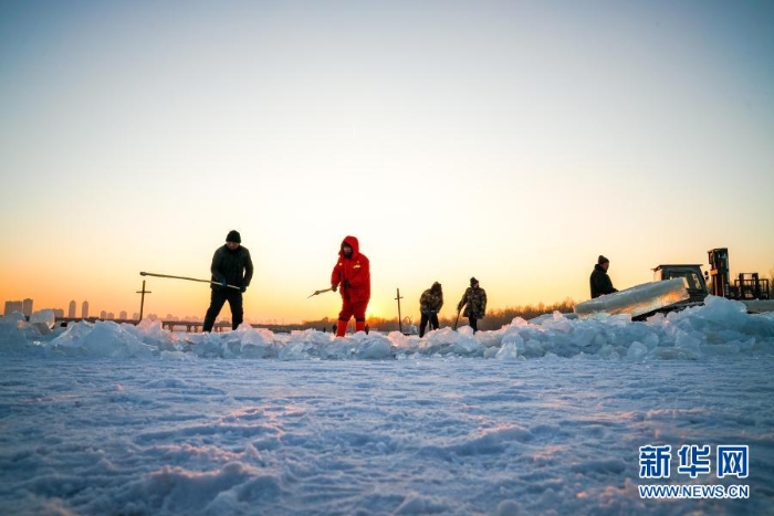 12月7日,工人在松花江哈爾濱段江面上采冰。