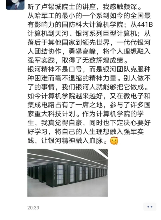 12月10日晚,一場(chǎng)“40后”與“00后”跨越時(shí)空對(duì)話在國(guó)防科技大學(xué)上演,74歲的盧錫城院士用了兩個(gè)小時(shí),為大一學(xué)員講述銀河人“篳路維艱、薪火相傳”的創(chuàng)業(yè)史,將學(xué)員們的思緒拉回了那個(gè)艱辛而又輝煌的創(chuàng)業(yè)年代。