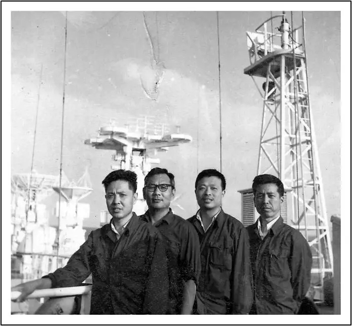 盧錫城隨遠(yuǎn)望一號(hào)測(cè)量船赴南太平洋保障我國(guó)首次洲際導(dǎo)彈發(fā)射任務(wù)(右二為盧錫城)