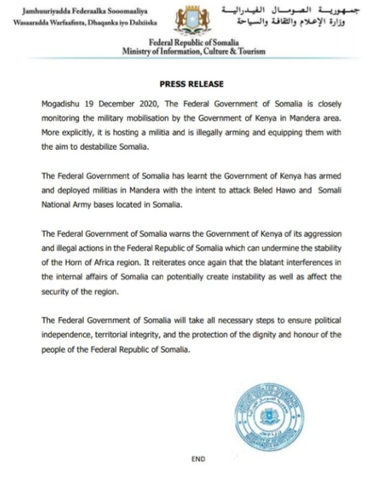 當?shù)貢r間12月19日,索馬里聯(lián)邦政府發(fā)表聲明稱,“索馬里政府正在密切監(jiān)視肯尼亞在兩國邊境曼德拉地區(qū)的軍事動員。”