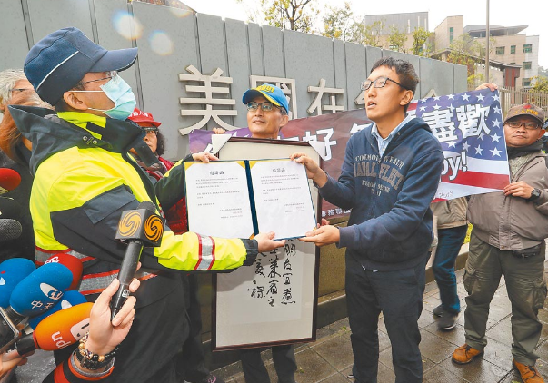 島內(nèi)民間反瘦肉精毒豬聯(lián)盟21日到美國在臺協(xié)會送邀請函,邀請AIT臺北辦事處處長酈英杰就萊克多巴胺健康風(fēng)險(xiǎn)進(jìn)行臺美民間科學(xué)對話,由保六總隊(duì)隊(duì)長收下轉(zhuǎn)交。(陳怡誠攝)圖片來源:臺灣《中時(shí)電子報(bào)》