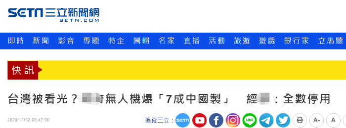 【環(huán)球網(wǎng)報(bào)道 記者 趙友平】除了臺(tái)“立委”發(fā)現(xiàn)專案信件發(fā)送自“我的華為手機(jī)”,昨天(12月1日)臺(tái)媒還在炒作大陸無(wú)人機(jī)。多家臺(tái)媒稱,民進(jìn)黨籍“立委”何欣純1日質(zhì)詢時(shí)聲稱,全臺(tái)各“政府”無(wú)人機(jī)中,有超過七成是中國(guó)(大陸)制,“恐有資安疑慮”。對(duì)此,島內(nèi)網(wǎng)友一句話評(píng)論扎心:“(有本事)臺(tái)灣自己做啊!技術(shù)趕得上大疆?差遠(yuǎn)了!”