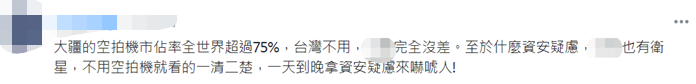 還有網(wǎng)友說,大疆的空拍機(jī)市占率全世界超過75%,臺(tái)灣不用,大陸完全沒差。至于什么資安疑慮,大陸也有衛(wèi)星,不用空拍機(jī)就看得一清二楚,“一天到晚拿資安疑慮來(lái)嚇唬人!”↓