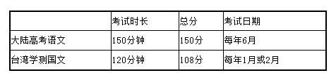 臺(tái)灣大學(xué)學(xué)科能力測(cè)驗(yàn)國文科考試(以下簡(jiǎn)稱“臺(tái)灣學(xué)測(cè)國文”)與大陸普通高等學(xué)校全國統(tǒng)一考試語文科目(以下簡(jiǎn)稱“大陸高考語文”)相比,首先是總分和考試時(shí)長(zhǎng)存在差異。