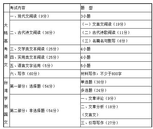 由上表可見,大陸比臺(tái)灣考試時(shí)長(zhǎng)多了半個(gè)小時(shí),總分多了42分。不僅如此,試卷結(jié)構(gòu)也存在明顯差異,請(qǐng)看下表: