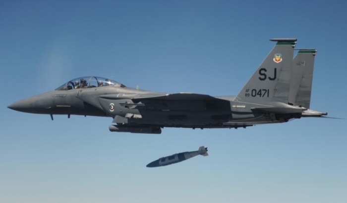 美軍F-15戰(zhàn)斗機(jī)投擲炸彈畫面