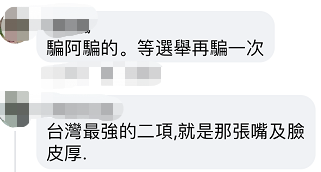 還有網(wǎng)友稱 “臺(tái)灣最強(qiáng)的兩項(xiàng),就是那張嘴及臉皮厚。"民進(jìn)黨慣會(huì)"騙啊騙,等選舉再騙一次。"