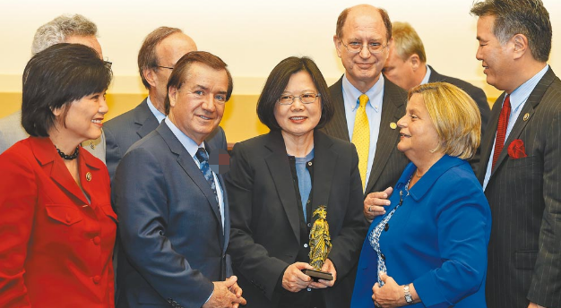 圖為2015年時任民進黨主席的蔡英文(中),受邀參加美國眾議院外交委員會歡迎酒會,眾議院前外交委員會主席羅絲蕾婷娜(Ileana Ros-Lehtinen)(右二)致贈華盛頓自由女神像,并與眾議院前外交委員會主席羅伊斯(Ed Royce)(左二)等人合影留念。(圖片來源:臺灣《中時電子報》資料照片)