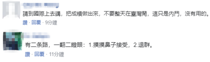 對(duì)此,有網(wǎng)友諷刺,“請(qǐng)到國(guó)際上去講,把成績(jī)做出來,不要整天在臺(tái)灣鬧,這只是內(nèi)斗,沒有用的?!薄坝袃蓷l路,一翻二瞪眼:1.摸摸鼻子接受,2.退群?!?/p>