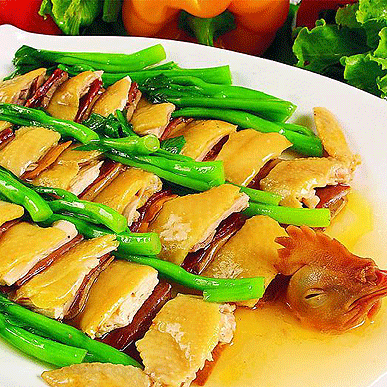 以海南島文昌雞為主料,配以火腿 、雞肝、郊菜,經(jīng)煮、蒸、炒而成。此菜造型美觀,芡汁明亮,肉質(zhì)滑嫩,香味甚濃,肥而不膩。三樣配料顏色不同,滋味各異,為廣州八大名雞之一。