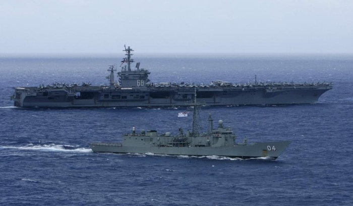 這是2012年7月18日,在美國(guó)夏威夷瓦胡島以北海域,參加“環(huán)太平洋”軍演的一艘澳大利亞海軍艦只(前)和美國(guó)海軍“尼米茲”號(hào)航母一同航行的資料照片。新華社/路透