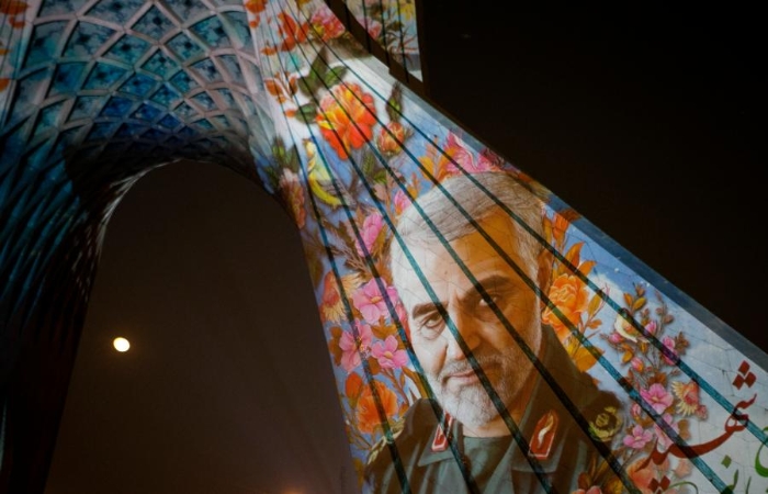 1月1日,伊朗伊斯蘭革命衛(wèi)隊(duì)下屬“圣城旅”指揮官蘇萊曼尼的頭像被投射到德黑蘭地標(biāo)建筑自由塔上,悼念蘇萊曼尼遇難周年。新華社發(fā)