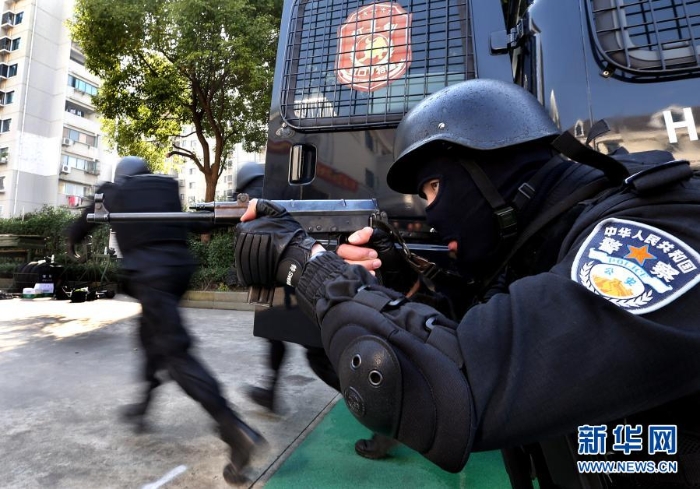 2017年11月24日,上海虹口公安分局特警支隊(duì)“虹劍”突擊隊(duì)隊(duì)員練習(xí)迅速出擊。 新華社記者 凡軍 攝