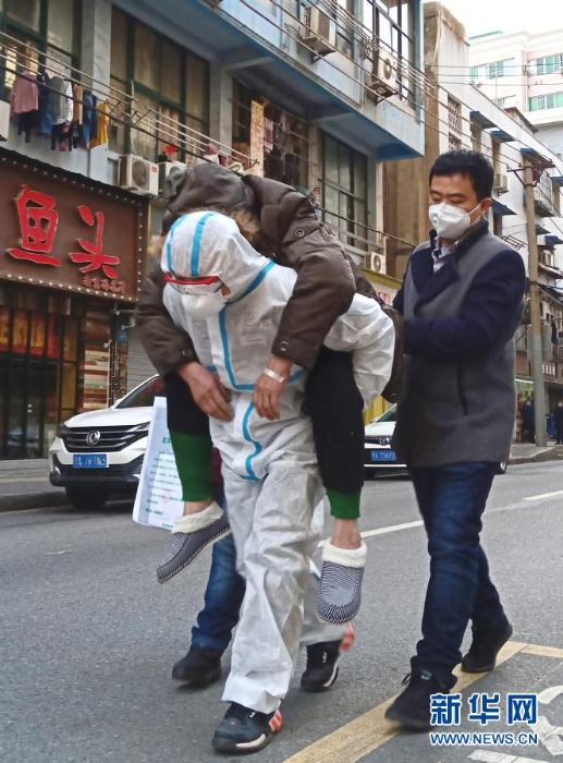 2020年1月30日,武漢市江岸區(qū)大智街派出所民警邵玉春背著病患準(zhǔn)備送醫(yī)。新華社發(fā)