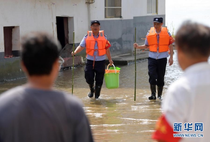 2020年7月22日,江西省彭澤縣棉船鎮(zhèn)棉船派出所的梅玉勝(左二)和同事幫助一名家中進(jìn)水的居民拿取生活必需品。新華社記者 彭昭之 攝