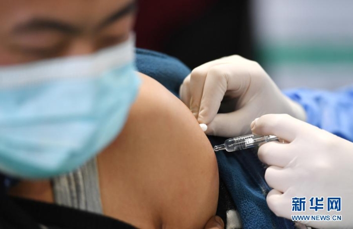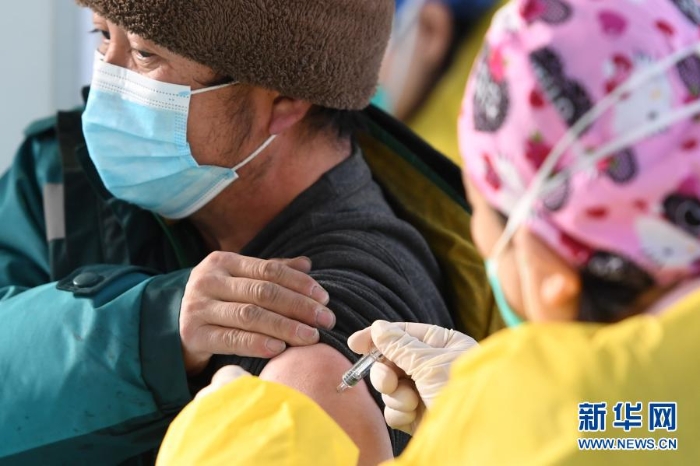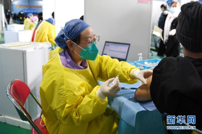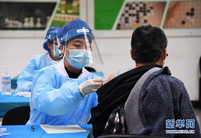 在北京市海淀區(qū)中關(guān)村街道臨時集中接種點,醫(yī)務(wù)人員為接種人員注射新冠疫苗(1月6日攝)。