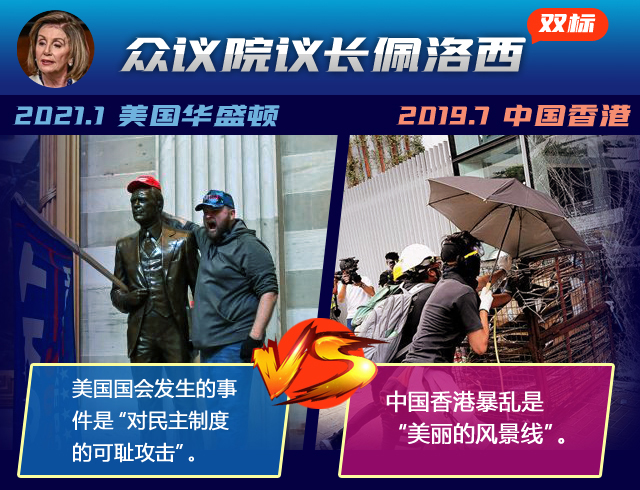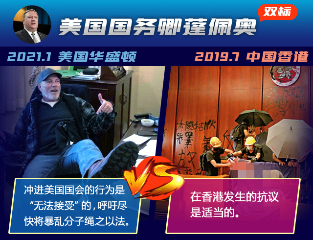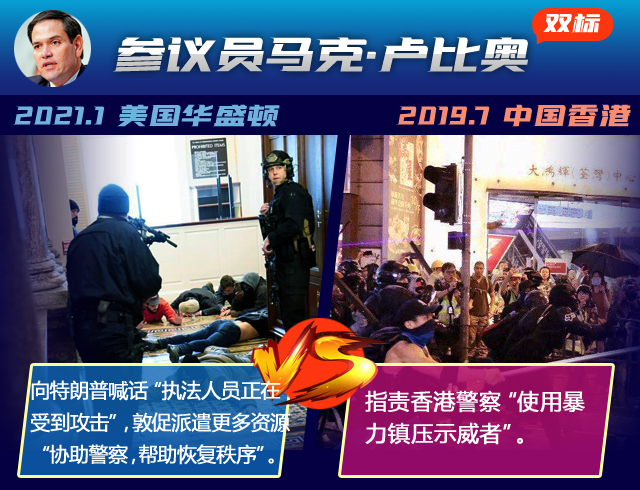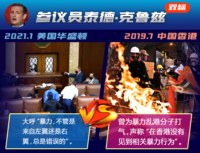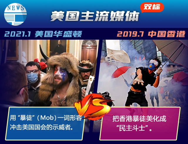 這場鬧劇中,美國一些政客的“雙標”已毫無底線。2019年7月,香港激進示威者曾暴力沖擊香港立法會大樓,暴力破壞立法會設施并襲擊警察。似曾相識的情景,但美方一些人士和媒體作出的反應卻截然不同↓↓↓