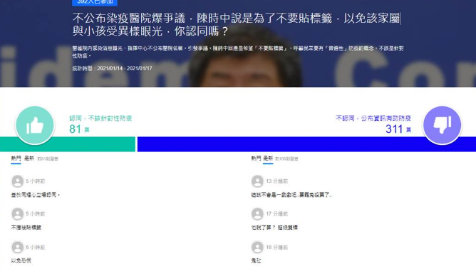 《Yahoo奇摩》14日就對此發(fā)起網(wǎng)絡(luò)投票民調(diào),以“不公布染疫醫(yī)院爆爭議,陳時(shí)中稱是為了不要貼標(biāo)簽,呼吁民眾要有普遍性防疫的概念,以免該家屬與小孩受異樣眼光,你認(rèn)同嗎?”為題詢問廣大網(wǎng)友看法,投票時(shí)間為1月14日至17日,截至14日晚間5時(shí)40分為止,共有近400名網(wǎng)友投票,投“不認(rèn)同,公布信息有助防疫”的人有308票,比例占79.6 %,投“沒影響”的票數(shù)為81票,比例占21.4%。