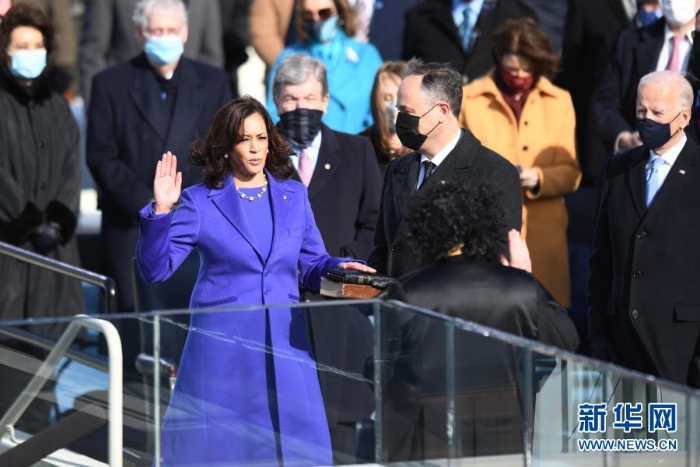 1月20日,在美國首都華盛頓國會山,哈里斯(前左)在就職典禮上宣誓就任美國副總統(tǒng)。