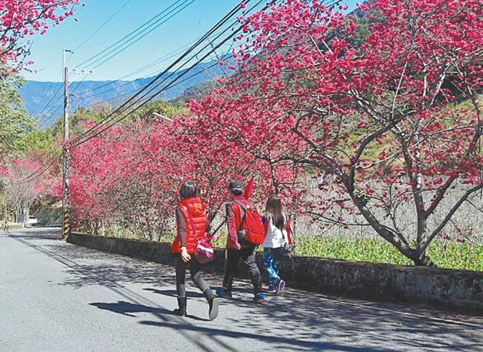 每年春季櫻花盛開(kāi)期,許多民眾喜愛(ài)前往信義鄉(xiāng)草坪頭,欣賞滿山粉紅綻放的氣氛。(草坪頭觀光茶園提供/黃立杰南投傳真)