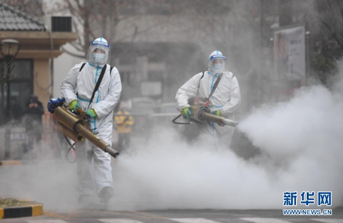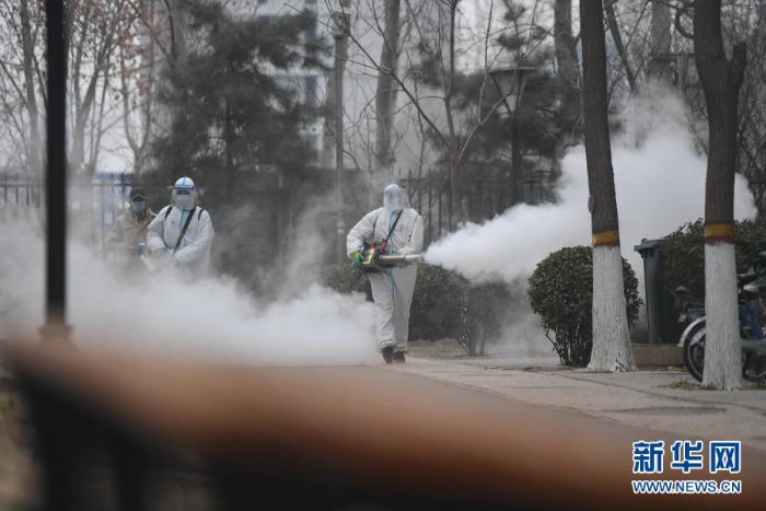 1月24日,工作人員在石家莊市裕華區(qū)藍(lán)郡名邸小區(qū)開(kāi)展消殺作業(yè)。