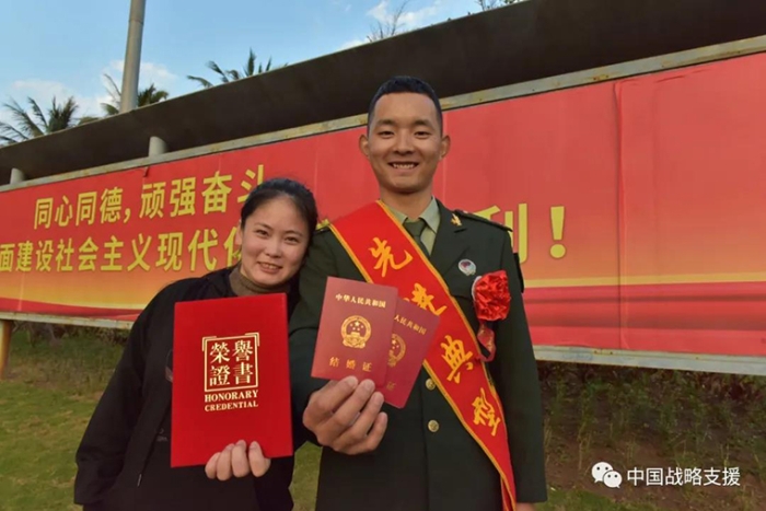 會(huì)場(chǎng)上,一對(duì)婚齡只有一天的新人格外惹人注目。該部戰(zhàn)士陸倪和妻子郭利利結(jié)束了長(zhǎng)達(dá)7年的愛情長(zhǎng)跑。剛一領(lǐng)證,就被機(jī)關(guān)邀請(qǐng)來(lái)參加表彰。