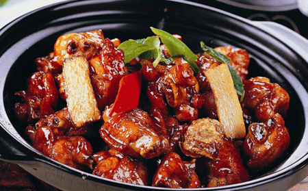 三杯雞是臺灣的代表菜式。何謂三杯雞即一杯醬油膏、一杯米酒、一杯黑麻油。精選上等的雞腿和雞翅中,雞肉經(jīng)過蔥、姜、蒜和醬油膏24小時腌制,把腌制好的雞肉放到油鍋中炸到金黃,再用麻油把蒜瓣炒至金黃,把蒜瓣和雞肉放入鍋中同炒,再加入三杯醬料。此道菜中還加入了一種臺灣特有的香料——九層塔。