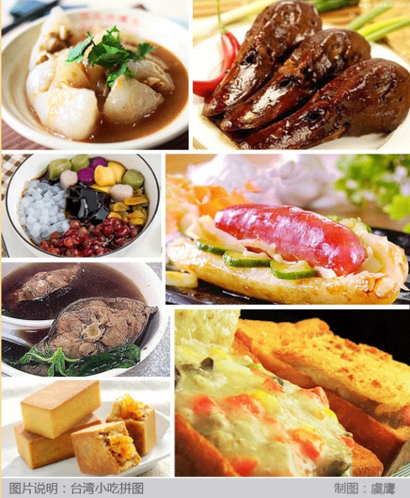 蚵仔煎、虱目魚肚粥、炒米粉、大餅包小餅、萬巒豬腳、大腸蚵仔面線、甜不辣、臺南但仔面、潤餅、燒仙草、筒仔米糕、花枝羹、魚酥羹、肉羹、豬血糕、東山鴨頭、肉圓、鹵肉飯、波霸奶茶、布丁豆花等,藥燉排骨、藥燉土虱,皆是臺灣風(fēng)味獨特的名食小吃。