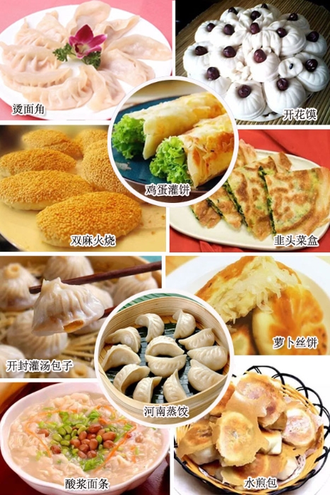 十大面點:河南蒸餃、開封灌湯包子、雙麻火燒、雞蛋灌餅、韭頭菜盒、燙面角、酸漿面條、開花饃、水煎包、蘿卜絲餅。