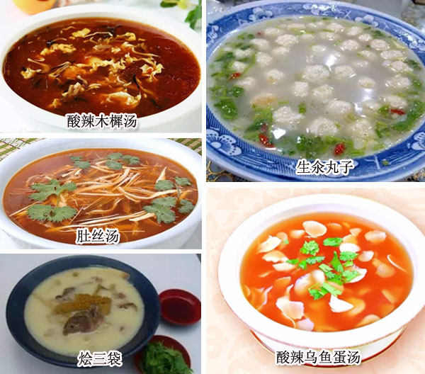 五大名湯:酸辣烏魚蛋湯、肚絲湯、燴三袋、生汆丸子、酸辣木湯。