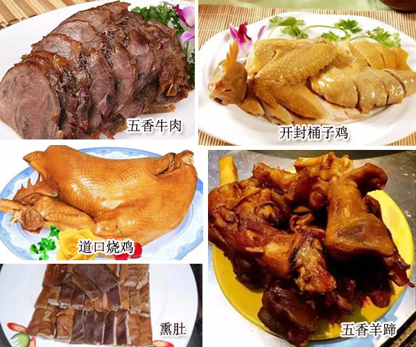 五大鹵味:開封桶子雞、道口燒雞、五香牛肉、五香羊蹄、熏肚。