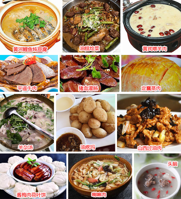 晉菜中的傳統(tǒng)名菜有糖醋魚、鍋燒羊肉、蔥爆柏籽羊肉、拔絲山藥、鐵碗烤蛋、腐乳肉、山西過油肉、醬梅肉荷葉餅、老大同什錦火、香酥雞、黃芪煨羊肉、酸湯羊肉、烤羊排/烤羊脊、糖醋鯉魚、黃河鯉魚燉豆腐、驢肉鼎鼎香、罐燜鹿肉、鵪鶉茄子、蜜汁開口笑、涼粉炒饃、晉城十大碗、高平十大碗、巴公燒大蔥、陽城燒肝、高平燒豆腐、陵川黨參燉土雞、晉味焗南瓜、鐵板土豆泥、地皮菜燴絲絲、蒲棒長山藥、晉南四味、油潑黃河大鯉魚、黃酒燜肉、西紅柿燴莜面魚魚、紅薯琥珀肉、太谷熏鴿、平遙牛肉、定襄蒸肉、晉中壓花肉等。