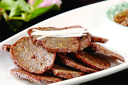 很久以前,陽城有個(gè)姓甘的縣丞,他巧取豪奪,搞得民不聊生。南城墻下住著三兄弟,老大以殺豬、賣肉為生,老二以賣菜為業(yè)。老三從小好讀書,是城內(nèi)少有的才子。隆冬晚間,有王屋山下的學(xué)友來訪,老三因家中米無半粒、菜無片葉,無以招待。想去老大家討些肉食,無奈老大家只剩半葉豬肝;轉(zhuǎn)到老二家,老二的菜已賣盡,筐中只有幾瓣大蒜。老三拿著往家返,一路尋思:在陽城,豬下水(內(nèi)臟)是從來不吃的,更不用說招待客人了,這該如何是好……回到家中,他讓內(nèi)人將豬肝和大蒜洗凈、剁碎,揉在一塊。用菜葉包住蒸熟后,切成片。老三與客人每人拿一根竹簽,圍坐在火爐旁烤著吃。頓時(shí),蒜香味、肝香味彌漫在空中??腿顺灾@外焦里嫩的食品,大呼:美!問老三菜名,老三沉思片刻,想著縣丞的無情、嘆百姓的清苦,為泄心中之憤,脫口而出:燒甘(肝)!從此,燒肝就迅速在陽城流傳開來,并逐漸改進(jìn)制作方法,成為陽城的一道名吃。