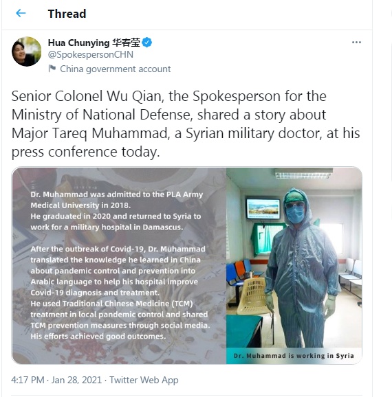 隨后,華春瑩在推特上發(fā)文稱,在剛剛舉行的國防部例行記者會上,國防部新聞發(fā)言人吳謙大校分享了敘利亞軍醫(yī)塔里克的故事。