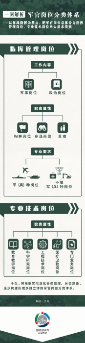 指揮管理崗位按照工作內(nèi)容,分為軍事崗位、政治崗位,這是基于我軍根本性質(zhì)、根本宗旨和“軍政雙首長(zhǎng)制”等制度安排劃分的,充分貫徹和體現(xiàn)了黨對(duì)人民軍隊(duì)的絕對(duì)領(lǐng)導(dǎo)的根本原則和制度;按照職責(zé)屬性,分為指揮崗位、參謀崗位等,這是依據(jù)不同崗位在作戰(zhàn)行動(dòng)和部隊(duì)建設(shè)中的地位作用和職責(zé)任務(wù)劃分的;按照專業(yè)要求,分為軍種(兵種)崗位、不限軍種(兵種)崗位,這是依據(jù)崗位履職所需的專業(yè)知識(shí)、經(jīng)歷和經(jīng)驗(yàn)劃分的。