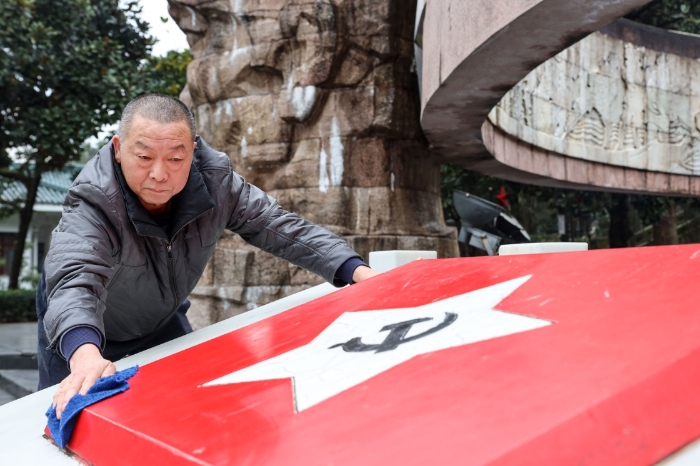 1月25日,楊愛民在遵義紅軍烈士陵園內(nèi)擦拭雕塑。新華社記者 歐東衢 攝