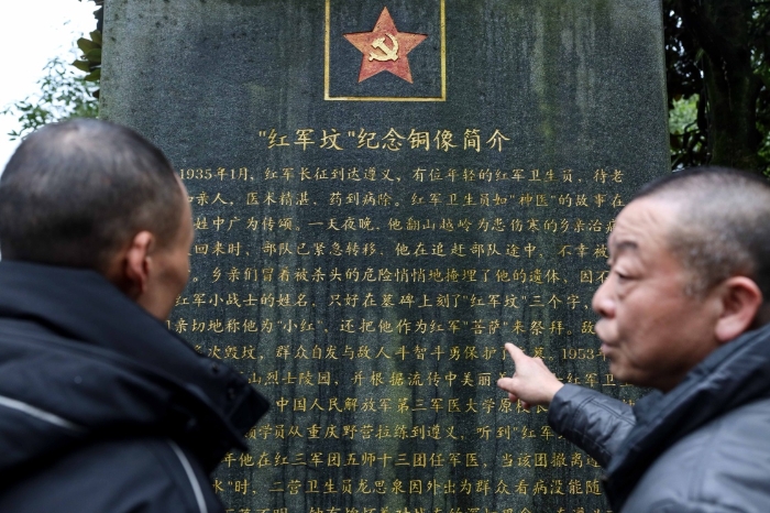 1月25日,楊愛民在遵義紅軍烈士陵園內(nèi)為參觀者宣講紅軍紀(jì)念銅像的歷史。新華社記者 歐東衢 攝