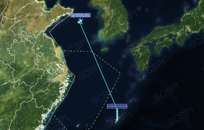 據(jù)“南海戰(zhàn)略態(tài)勢(shì)感知”計(jì)劃平臺(tái)2月3日發(fā)布的消息,當(dāng)天上午一架美國(guó)空軍的RC-135S電子偵察機(jī)現(xiàn)身黃海上空。從路線上看,該機(jī)從沖繩基地起飛,穿過(guò)東海防空識(shí)別區(qū)后抵達(dá)黃海,在靠近膠東半島的位置掉頭。另外還有一架KC-135T加油機(jī)當(dāng)天早些時(shí)候也從沖繩起飛,為RC-135S電子偵察機(jī)提供空中加油支持。