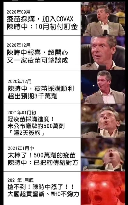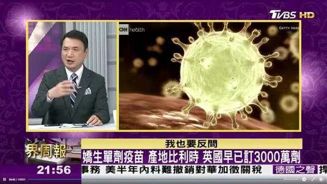 臺(tái)灣資深主持人陳文茜在《TVBS文茜的世界周報(bào)》節(jié)目上怒批,所有提倡應(yīng)該等著打臺(tái)灣本土生產(chǎn)疫苗的人,以后都不準(zhǔn)打、也沒資格打國(guó)外疫苗。前臺(tái)灣“國(guó)安會(huì)副秘書長(zhǎng)”楊永明也在節(jié)目中質(zhì)疑,世界各國(guó)各地早就下訂疫苗,新加坡都已經(jīng)打了10多萬劑,歐盟的疫苗不僅只會(huì)讓自己人先打,而且量也不夠。“為什么不老早在去年的9、10月、11月就做這些動(dòng)作呢?就去訂疫苗呢?”