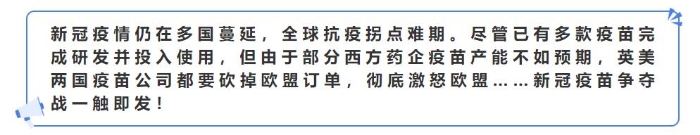 另一方面,繼美國公司輝瑞表示無法按時交付疫苗后,英國阿斯利康制藥公司近日也告知歐盟,受產(chǎn)能限制,決定將今年第一季度向歐盟交付疫苗由原定的8000萬劑減至3100萬劑。