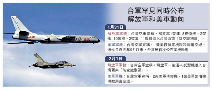 臺(tái)灣防務(wù)部門日前稱,當(dāng)日有一架美國(guó)偵察機(jī)進(jìn)入所謂臺(tái)灣“防空識(shí)別區(qū)”西南角;這是臺(tái)軍去年9月設(shè)立“即時(shí)軍事動(dòng)態(tài)”以來,首次通報(bào)美軍軍機(jī)動(dòng)態(tài)。2月1日和2日臺(tái)軍方公布解放軍戰(zhàn)機(jī)動(dòng)向的同時(shí),也宣稱美國(guó)軍機(jī)現(xiàn)蹤周邊空域。有分析指出,臺(tái)灣方面被解放軍近期的大規(guī)模演練嚇破膽,于是宣揚(yáng)美國(guó)軍機(jī)的動(dòng)態(tài),企圖給自己壯膽,營(yíng)造“美國(guó)保護(hù)臺(tái)灣”氛圍,但有學(xué)者批評(píng)這是臺(tái)當(dāng)局一廂情愿的想法,只是為了自我安慰。