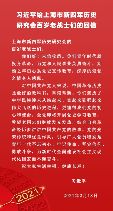 習(xí)近平給上海市新四軍歷史研究會(huì)百歲老戰(zhàn)士們回信時(shí)強(qiáng)調(diào)