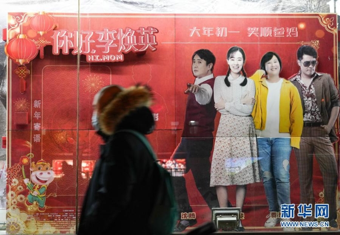 2月17日,在北京的中影國際影城外,市民從電影《你好,李煥英》海報前走過。