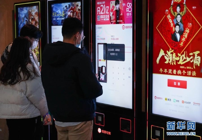 2月17日,觀眾在北京王府井的橫店電影城自助取票機前取票。