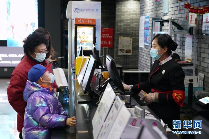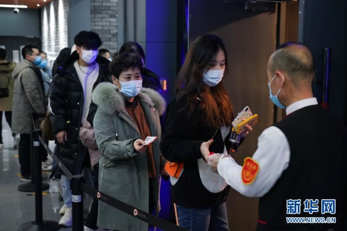 2月17日,觀眾在北京前門的保利國際影城影廳外檢票進場。