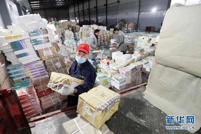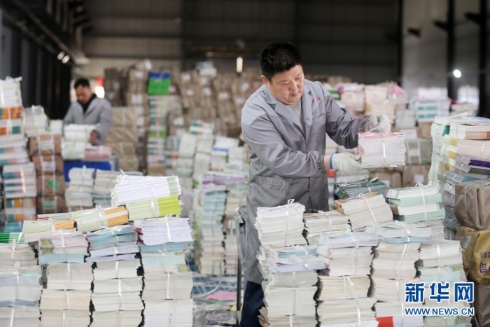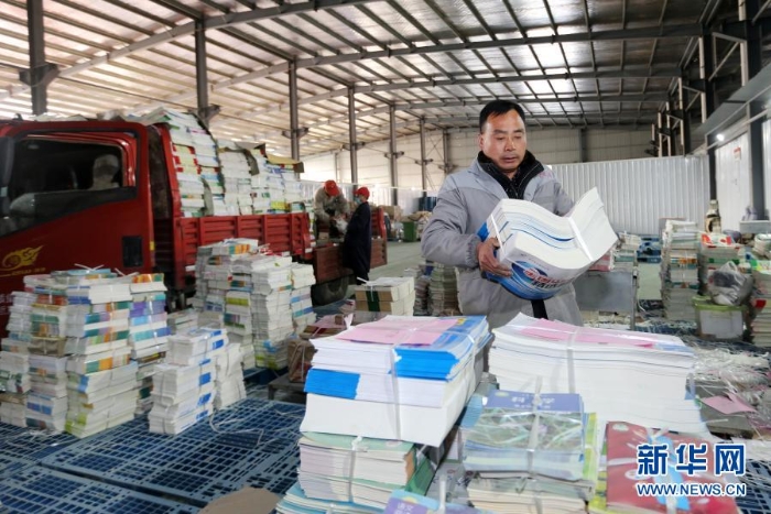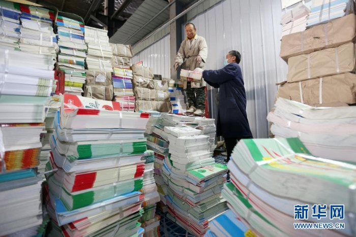 2月18日,在安徽省淮北市新華書店教材倉庫內(nèi),工作人員在分類整理新學(xué)期教材。