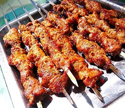 新疆人制作的羊肉好吃是出了名的,口感滑嫩并且沒有膻味,食之爽口也不用擔(dān)心上火??狙蛉獯梢哉f是風(fēng)靡全國(guó)的一種新疆傳統(tǒng)小吃,正宗的烤羊肉串是在特制的烤肉槽上烤炙,用無煙煤作燃料。烤肉很大氣,首先將凈肉剔下來,肥瘦搭配地穿在細(xì)鐵釬上,將它們疏密均勻地排放在燃著的無煙煤的槽形鐵皮烤肉爐子上,維族漢子左手握著鐵釬不停地在煤火上翻烤,右手嫻熟地撒上精鹽、辣椒面、孜然粉等佐料,數(shù)分鐘即熟。其色焦黃、油亮。瘦肉入口香嫩,肥肉外脆而焦,味道微辣中帶著鮮香,不膩不膻,鮮嫩可口。
